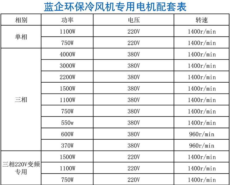 二、藍企環(huán)保冷風(fēng)機(環(huán)??照{(diào))專用電機配置表
